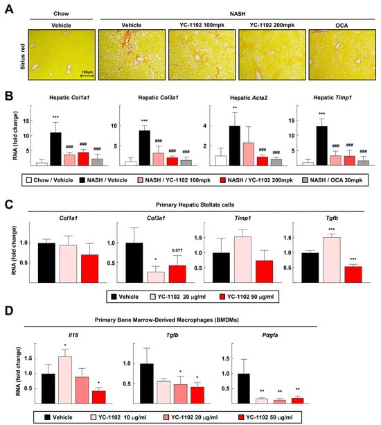 Anti-fibrotic effects of YC-1102 in the liver. (A) Representative images of Sirius Red staining of liver tissue. (B) Hepatic mRNA transcriptions of Col1a1, Col3a1, Acta2, and Timp1 were analyzed using qRT-PCR. n = 5 for each group. ** p < 0.01 and *** p < 0.001 vs. chow with vehicle; ### p < 0.001 versus NASH with vehicle. (C) Primary hepatic stellate cells (HSCs) activated through TGFβ stimulation were treated with YC-1102. mRNA transcriptions of Col1a1, Col3a1, Timp1, and Tgfb in primary HSCs were analyzed using qRT-PCR. n = 4 for each group. (D) Primary BMDMs were stimulated with LPS after YC-1102 treatment. mRNA transcriptions of Il18, Tgfb, and Pdgfa in primary BMDMs were analyzed using qRT-PCR. n = 4 for each group. * p < 0.05, ** p < 0.01, and *** p < 0.001 vs. vehicle. The data represent mean ± SD. Statistical analyses were performed using one-way ANOVA with Bonferroni’s post hoc test.