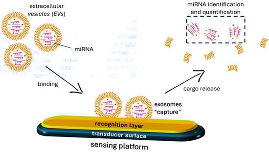 Recent studies have demonstrated that exosomal miRNAs can significantly impact myogenic differentiation by modulating cellular activities such as myoblast proliferation, differentiation, fusion, and muscle fiber maturation [97]. For example, miR-1 and miR-206 have been found to promote myogenic differentiation by targeting HDAC4, a negative regulator of muscle differentiation [89], while miR-133 inhibits muscle differentiation by targeting serum response factor (SRF), a key regulator of muscle-specific gene expression [98]. These molecules contribute to the regulatory network controlling muscle development, and their dysregulation can have implications for muscle-related diseases, such as muscular dystrophy or muscle wasting conditions. Moreover, the specific functions of miRNAs can vary depending on the context of muscle development and the stage of myogenesis [99]. These findings suggest the potential of these molecules in developing effective therapies for muscle disorders and provide insight into the complex mechanism of intercellular communication [71]. The encapsulation of miRNA into exosomes serves as a protective mechanism for these molecules, preventing their degradation by extracellular RNases. Additionally, it facilitates the targeted delivery to specific cells, allowing for intercellular communication and modulation of gene expression [100]. While the detailed mechanisms of sorting are still an important area of research, it has been proposed that the presence of specific motifs or sequences, often referred to as “EXO motifs” or “exosomal targeting sequences”, plays a role in guiding miRNAs into exosomes [101]. Recent research has shown that mature miRNAs contain specific motifs at their 3′-end, including uridine-rich sequences. These EXO motifs are thought to interact with two RNA-binding proteins, heterogeneous nuclear ribonucleoprotein A2B1 (hnRNPA2B1) and Y-Box protein 1 (YBX1), which act as chaperones and regulate the recognition and transport of miRNAs in exosomes. Other key factors such as the endosomal sorting complexes required for transport (ESCRT) machinery, the lipid composition of the exosomal membrane, and interactions with tetraspanins may also contribute to this process. Increasing evidence suggests that the packaging of miRNAs in exosomes is related to the presence of specific EXOmotif sequences following muscle-damaging stimuli [102]. For instance, activation of muscle satellite cells (SCs), in response to muscle injury, leads to exosomal release of the CCCG-EXOmotif containing miR-206, involved in SC differentiation and muscle regeneration [103]. Similarly, muscle damage associated with Duchenne muscular dystrophy (DMD) stimulates the release of miR-1 containing the GGAC-EXOmotif, miR-206 containing CCCG, and miR-133a containing the CCCU sequence, which has a pro-survival effect [104,105]. Their tissue-specific expression patterns make EXOmotifs and, more in general, miRNAs promising biomarkers for both diagnostic and prognostic interventions [106]. Monitoring these molecules can occur through their direct detection in biological fluids or by capturing the vesicles containing them [107,108,109,110,111]. The latter is particularly interesting, as exosomes are regarded as biomarkers with enormous potential for diagnosing, tracking, and treating various diseases. Exosomes are present in almost all body fluids, with their cargoes changing under physiological or pathological conditions, making them ideal as cell signaling mediators and sources of diverse biomarkers. Conventional exosome isolation methods are often expensive and inefficient, yielding vesicle-enriched solutions but containing unwanted components [109,112]. Developing sensors/biosensors could overcome these limitations, facilitating the widespread use of liquid biopsy-based analysis in clinical practice, although this has only been sporadically explored. In one example [109], sensing platforms were developed by functionalizing silicon oxide substrates with different receptors to capture exosomes. Functional assays were conducted to test these sensors using both exosome-mimicking vesicles and exosomes isolated from cell supernatants. The various surfaces exhibited promising properties, with the negatively charged surface capable of capturing over 4 × 108 exosomes per square centimeter. The captured exosomes were recovered, and their biomarker cargoes were analyzed (Figure 2).