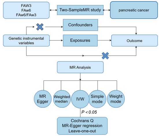 A bidirectional MR analysis was conducted to explore the causal relationship between PUFAs and PC, considering a p-value of less than 0.05 to be statistically significant. Heterogeneity among instrumental variables was assessed using Cochran’s Q test, erogeneity. The MR-Egger regression method assessed potential pleiotropy effects across the IVs, and directiol pleiotropy was visually represented through funnel plots. The symmetry of these plots served as an indicator of pleiotropy [23,24]. Pleiotropy bias was further addressed by identifying and removing outliers using the MR-PRESSO tool version 1.0, subsequently evaluating the impact of outlier removal on the causal inference to enhance analytical accuracy and robustness [25]. A leave-one-out sensitivity analysis was performed to verify the stability and consistency of the findings, systematically excluding each SNV to ensure result reliability [26]. Analyses were executed using the MR-PRESSO, TwoSampleMR (version 0.5.6), and Mendelian Randomization packages in R software (version 4.3.3).