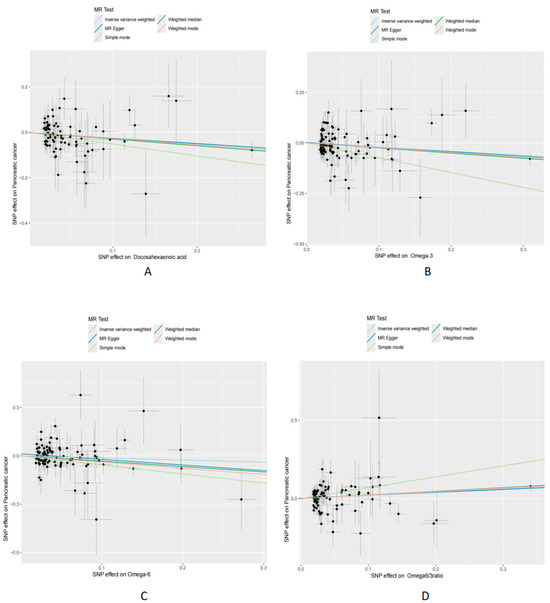 Scatterplot for MR analysis of causal effects of PUFAs on PC. (A) DHA on PC; (B) FAω3 levels on PC; (C) FAω6 levels on PC; (D) FAω6 to FAω3 ratio on PC. MR: Mendelian Randomization; PC: pancreatic cancer; FAω3 levels: Omega-3 fatty acid levels; FAω6 levels: Omega-6 fatty acid levels. FAω6 to FAω3 ratio: the ratio of Omega-6 to Omega-3.