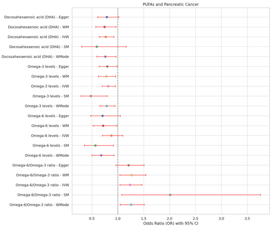 Exploring the association between PUFAs and PC using forest plots. MR: Mendelian Randomization; OR: Odds Ratio; CI: Confidence Interval; PC: pancreatic cancer.