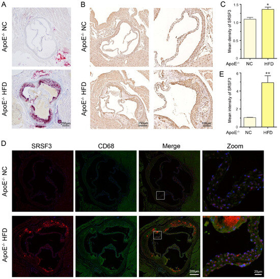 Atherosclerosis is a lipid-regulated chronic inflammatory disorder. In addition to foam cell formation, inflammatory macrophages play a vital role in the occurrence of atherosclerotic plaques. To investigate the potential role of SRSF3 in inflammatory macrophages, we examined its expression in ApoE−/− mice, a widely used model for atherosclerosis. The mice were divided into groups and fed an NC or HFD for 8 weeks. The Oil Red O staining of the aorta and aortic root confirmed the formation of atherosclerotic plaque (Figure 1A). We then explored the SRSF3 protein expression in these atherosclerotic lesions. Both the immunohistochemical and immunofluorescence staining measurements revealed increased SRSF3 protein levels in the atherosclerotic plaques (Figure 1B–E). Furthermore, the double immunofluorescence staining for SRSF3 and CD68 (a macrophage biomarker) indicated that the SRSF3 expression was predominantly situated in macrophages within the atherosclerotic lesion (Figure 1D,E). The upregulation of SRSF3 in these lesions implies that SRSF3 is responsible for the inflammatory response of macrophages.