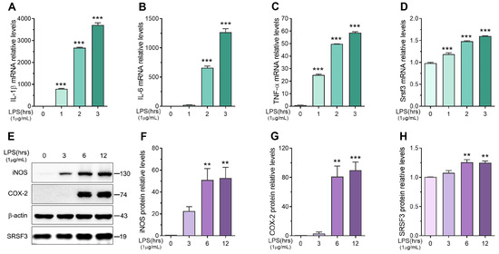The expression level of SRSF3 was increased in RAW-264.7 cell lines treated with lipopolysaccharide: (A–C) the inflammatory response of the macrophages was detected by measuring the mRNA expression of cytokines, including IL1β, IL6, and TNFα; (D) the level of SRSF3 in the lipopolysaccharide-treated RAW-264.7 cell line was determined using qPCR, with GAPDH as the housekeeping gene; (E–H) the protein levels of iNOS, COX2, and SRSF3 were assessed using immunoblotting with β-actin as an internal control. Mean ± SEM (n = 3). Statistical differences compared to controls (timepoint 0), ** p < 0.01, *** p < 0.001.