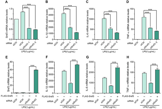 SRSF3 depletion downregulated mRNA levels of cytokines in lipopolysaccharide-treated RAW-264.7 cell line: (A–D) RAW-264.7 cell line was transfected with siRNAs, followed by treatment with and without 1 μg/mL lipopolysaccharides for 3 h; (E–H) RAW-264.7 cell line underwent co-transfection with siRNAs and pECMV-FLAG-Srsf3 plasmids. The mRNA expression of SRSF3 and cytokines was evaluated via qPCR. Note: siCtrl, negative control siRNA; siSrsf3-1/2, Srsf3 siRNA-1/2; siSrsf3, Srsf3 siRNA-1 and -2. Mean ± SEM (n = 3). Statistical differences compared to lipopolysaccharide-treated siSrsf3, *** p < 0.001.