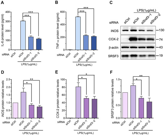 To explore the role of SRSF3 in the lipopolysaccharide-induced inflammatory response of macrophages, SRSF3-specific siRNAs were used to downregulate the SRSF3 expression. The results shown in Figure 3A–D demonstrate that the mRNA levels of IL1β, IL6, and TNFα were upregulated upon lipopolysaccharide stimulation but significantly decreased following SRSF3 knockdown. In addition, our study indicates that the overexpression of SRSF3 could rescue the downregulation of lipopolysaccharide-stimulated cytokines through SRSF3 siRNAs (Figure 3E–H). Furthermore, ELISA and immunoblotting measurements were conducted to examine the protein levels of lipopolysaccharide-induced inflammatory cytokines after SRSF3 knockdown. The downregulation of SRSF3 markedly reduced the expression of lipopolysaccharide-induced IL6 and TNFα proteins in RAW-264.7 macrophages (Figure 4A,B). Additionally, as shown in Figure 4C–F, SRSF3 knockdown led to a downregulation of the lipopolysaccharide-stimulated protein levels of iNOS and COX2. These results indicated that the downregulation of SRSF3 could inhibit the lipopolysaccharide-induced expression of inflammatory cytokines in the RAW-264.7 cell line.