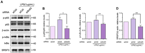 SRSF3 knockdown reduced lipopolysaccharide-stimulated NFκB pathway activation in RAW-264.7 cell line. (A) RAW-264.7 cell line underwent transfection with SRSF3 siRNAs or siCtrl, followed by treatment with 1 μg/mL lipopolysaccharide for 1 h. The phosphorylated levels of p65 and IκBα in the NFκB axis were determined via immunoblotting. (B–D) The phosphorylated p65 and IκBα protein levels were normalized to p65 and IκBα, respectively, while the SRSF3 protein level was normalized to β-actin. Note: siCtrl, negative control siRNA; siSrsf3, Srsf3 siRNA-1 and -2. Mean ± SEM (n = 3). Statistical differences compared to lipopolysaccharide-treated siCtrl, * p < 0.05, ** p < 0.01.