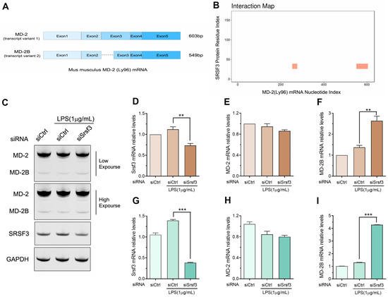 SRSF3 regulated the alternative splicing of MD2 mRNA. RAW-264.7 cell line underwent transfection with SRSF3 siRNAs or siCtrl, followed by treatment with 1 μg/mL lipopolysaccharides for 3 h. (A) The sequence alignment was performed to distinguish between the two transcript variants of MD2(Ly96) mRNA. (B) The interaction map of SRSF3 protein and MD2(Ly96) mRNA was generated using catRAPID omics v2.0. (C–F) RT-qPCR was employed for product- amplification from both MD2 and MD2B, with quantitation analysis results shown in (D) SRSF3, (E) MD2, and (F) MD2B. (G–I) The mRNA expression levels of SRSF3, MD2, and MD2B were assessed via qPCR. Statistical differences compared to lipopolysaccharide-treated siCtrl, ** p < 0.01, *** p < 0.001.