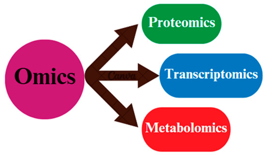 A schematic illusion diagram of the omics techniques (proteomics, transcriptomics, and metabolomics) that are commonly applied in biological samples.
