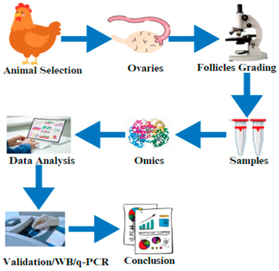The graphical abstract of this current review article indicates the selection of the animals and the isolation of the ovaries. After that, ovary/follicle samples are prepared for omics (proteomics, transcriptomics, or metabolomics), data are validated by using Western blotting (WB)/real-time q-PCR, and the results are finally compiled.