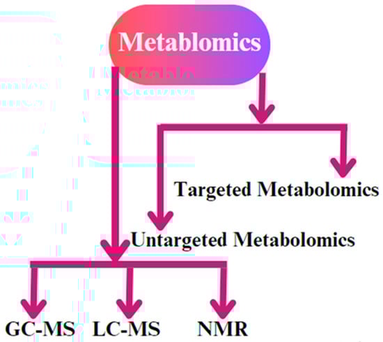 The different types of metabolomics techniques used for biological sample analysis. The most common methodologies that are applied are gas chromatography–mass spectrometry (GC-MS), liquid chromatography–mass spectrometry (LC-MS), and nuclear magnetic resonance (NMR) spectroscopy. In addition, untargeted metabolomic and targeted metabolomic techniques are used for biological replicates.