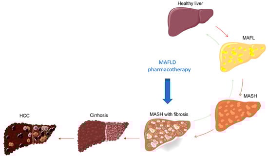 Exacerbation of MAFLD and pharmacotherapy to reverse the stage of fibrotic MASH to a healthy liver. MAFLD: metabolic-associated fatty liver disease, MAFL: metabolic-associated fatty liver, MASH: metabolic-associated steatohepatitis, HCC: hepatocellular carcinoma. Red arrow: worsening liver condition. Light green arrow: improving MAFLD stages. Blue arrow: target liver condition for MAFLD pharmacotherapy. Figure created with Servier Medical Art, https://smart.servier.com/ (accessed on 4 May 2024).