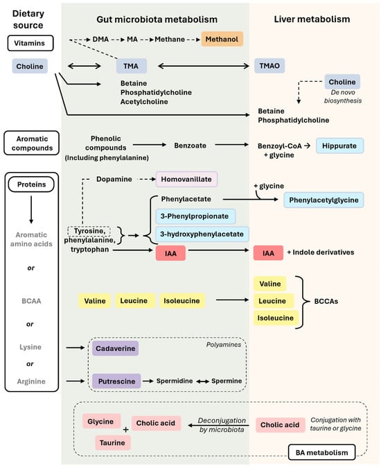 Microbiota-related co-metabolites derived from the metabolism of vitamins, aromatic compounds, protein, and BA. In this figure, we can observe how nutrients derived from vitamins, aromatic compounds, proteins, and BA are transformed in the intestine (by the action of the gut microbiota) or in the liver. Metabolites from the gut will reach then the liver. The colors used for the microbiota-related co-metabolites highlight their different nature and origin, which are described in the main text. Briefly, rectangles in orange refer to methanol (also seen in Figure 1), in dark blue to choline metabolism (choline, TMA, TMAO), in light blue to compounds derived from tyrosine, phenylalanine, and other aromatic compound metabolism (hippurate, N-Phenylacetylglycine, 3-Phenylpropionate, 3-hydroxyphenylacetate), in light purple to metabolites derived exclusively from tyrosine metabolism (homovanillate), in red to metabolites exclusively from tryptophan metabolism (IAA), in yellow to BCAAs (valine, leucine, isoleucine), in purple to polyamines (cadaverine, putrescine), and in pink to BA metabolism (cholic acid, glycine, taurine). Single-headed solid arrows indicate irreversible steps, while double-headed solid arrows indicate that the process can be reversible. Dashed line arrows refer to only from tyrosine metabolism, homovanillate is produced. Abbreviations: BA, bile acid; BCAAs, branched-chain amino acids; DMA, dimethylamine; IAA, indole-3-acetic acid; MA, methylamine; TMA, trimethylamine; TMAO, trimethylamine-N-oxide. The colors used for the microbiota-related co-metabolites highlight their different nature and origin, which are described in the main text.