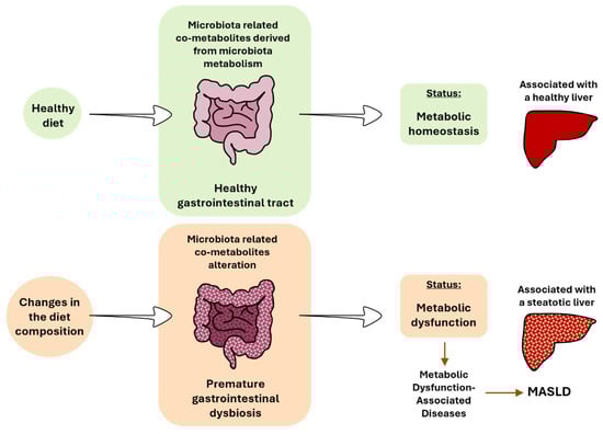 The change to hypercaloric diets based on high-fat, high-sugar, or high-fat and high-sugar have been associated with premature gastrointestinal dysbiosis. Bacteria will adapt quickly to survive to new dietary sources. Several species will benefit from this new availability of nutrients, while others will not, promoting a change in the microbiota diversity and subsequent derived metabolism pathways. An alteration of the gut microbiota has been described in the different stages of MASLD in rodents and patients [31,32,70,71]. In addition to the changes in the bacterial composition, changes in the mycobiome are beginning to be associated with MASLD [72]. This disruption results in the absence or alteration of key metabolites, contributing to MASLD [16] (Figure 3). The metabolic dysfunction concept arises from an imbalance in metabolic processes, leading to impaired glucose regulation (e.g., insulin resistance), abnormal lipid metabolism (e.g., dyslipidemia), dysfunctional energy production (e.g., mitochondria dysfunction), inflammation (e.g., oxidative stress), and accumulation of toxic byproducts (e.g., reactive oxygen species (ROSs), and oxidized lipids). Generally, metabolic dysfunction is often associated with the development of metabolic disorders, such as T2DM, obesity, and MASLD. In all these metabolic disorders, changes in the gut microbiota have been described, as previously cited. Again, an imbalance in bacterial metabolism should also be considered within this framework.