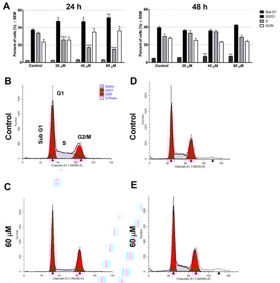 Flow cytometric analysis was performed to measure cellular DNA content. C33A cells were seeded into 12-well plates at a density of 100,000–150,000 cells/well. After overnight incubation, the samples were treated with escalating concentrations of the test compound for 24 and 48 h. The samples were collected for each well separately after a washing step with phosphate-buffered saline (PBS) and the trypsinization process, and the harvested cells and supernatants were centrifuged at 1400 rpm for 5 min at room temperature. After a washing step with PBS, cells were fixed in 300 µL of 70% ice-cold ethanol for 30 min. Cells were resuspended in a PI solution containing 10 µg/mL PI, 10 µg/mL RNase A, 0.1% Triton-X, and 0.1% sodium citrate solubilized in distilled water, and the samples were stored for 30 min in the dark, at room temperature. Cells were analyzed using a CytoFLEX-V0-B4-RO flow cytometer (Beckman Coulter, Brea, CA, USA). In each analysis, 20,000 events were measured, and the recorded data were evaluated by using ModFit LT 3.3.11 software (Verity Software House, Topsham, ME, USA) to determine percentages of the cells in each cell-cycle phase (subG1, G1, S, and G2/M). Untreated cells were considered as controls. Apoptotic cells were identified by sub-G1 phase in the cell-cycle distribution [52].
