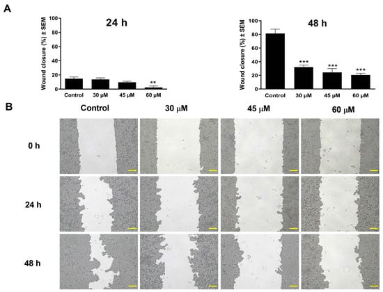 In addition to inhibiting cell proliferation, levosimendan suppressed the migration of the cervical cell line C33A, evaluated by a wound-healing assay through determining image-derived cell-free gaps at 0, 24, and 48 h post-treatment with various concentrations of levosimendan. After 24 h of incubation, only a concentration of 60 µM produced substantial effects. However, a significant inhibition of cell migration was detected after 48 h at all tested concentrations compared to untreated controls (Figure 3). These findings conclude that levosimendan significantly reduces the cell migration ability in a concentration- and time-dependent manner.