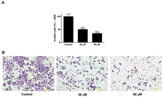 Effect of levosimendan on the invasion of C33A cells (A). The percentage of invading cells treated with levosimendan for 48 h (B). Representative images at 48 h post-treatment. The bar in the pictures indicates 100 µm. Data are presented as mean ± SEM. *** indicates p < 0.001, compared to untreated control samples. Findings are based on the results of two independent experiments done in duplicates.