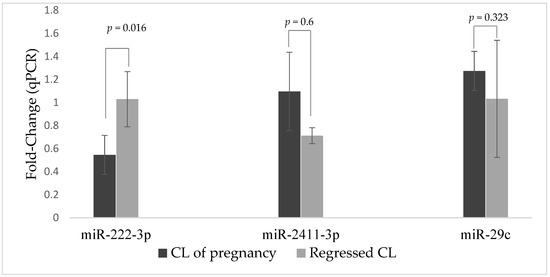 The expression of miRNAs in the pregnant corpus luteum (CL) regressed CL. The RT-qPCR fold change ratio was measured using the 2−ddct from fourteen CL (seven from each group). Comparison of mean values was performed using Student’s t-test on the dct values, and the p-values for each pair-wise comparison are indicated for each miRNA. Means were considered statistically different at p < 0.05.