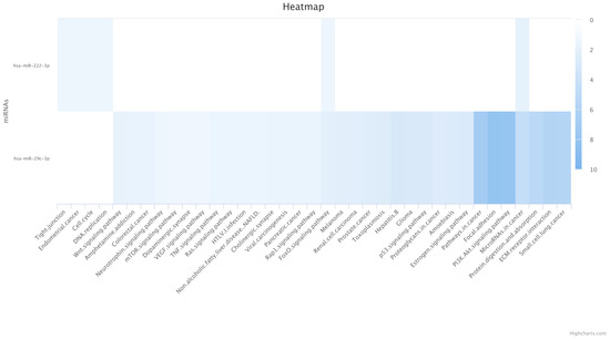 Enrichment results of hsa-miR-222-3p and hsa-miR-29c-3p for the categories of the KEGG database and experimentally validated miRNA–target interactions (MTIs). Rows: enrichment results for the targets of the two miRNAs; columns: all KEGG pathways that are significant for the different miRNAs. The absence of bta-miR-2411-3p on the heat map indicates that no enrichment was observed for this miRNA. The color of each field represents the significance of the association between the miRNA and the target pathway, depicted as the −log(p-value). Darker colors indicate more significant associations between the miRNA and the target pathway.