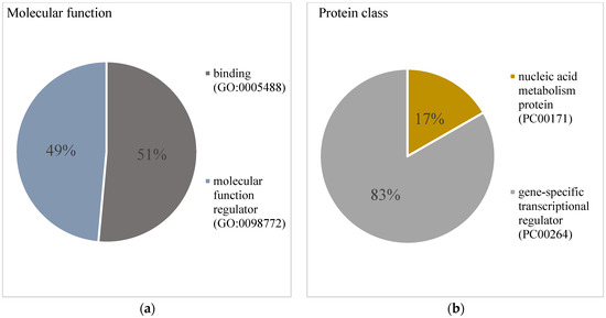 The molecular function and protein class gene ontology (GO). (a) For molecular function, the GO term “binding” represented 51% and the GO term “molecular function regulator” represented 49% of hits against the total number of genes. (b) For protein class, the GO terms “nucleic acid metabolism protein” and “gene-specific transcriptional regulator” represented 17% and 83%, respectively, of hits against the total number of genes.