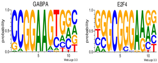 To elucidate the biogenesis regulation of the successfully validated bta-miR-222-3p, we utilized DIANA-miRGene V.4 [39], a repository that links miRNA transcription start sites (TSSs) with their respective transcription factors. Employing a miRNA-oriented mode with ovarian tissue samples archived in the repository, we predicted two distinct transcription factors: the GA-binding protein (GABP) transcription factor alpha subunit (GABPA) and the E2 transcription factor 4 (E2F4). The search was conducted using default filter criteria for transcription-factor-binding sites (TFBSs) within the region, which defines the distance from the predicted miRNA transcription start site (TSS) of the upstream (3000 bp) and downstream (500 bp) boundaries. Additionally, default criteria for the p-value and expression threshold (tags per one million, TPM) of transcription factors were applied.