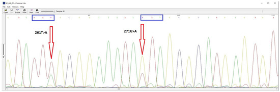 In the first stage of the study, sequencing data were obtained for regions of genes associated with resistance to clarithromycin and levofloxacin—23S rRNA (2142A > G, 2142A > C, and 2143A > G) and gyrA (codons 87 and 91), respectively, from twenty-five pure cultures of H. pylori. It was found that 11 (44%) out of the 25 samples had mutations in the clarithromycin resistance gene, and mutations in the levofloxacin resistance gene were detected in 13 (52%) samples, with 6 (24%) samples exhibiting dual resistance. Genetic variants in the 23S rRNA and gyrA resistance genes for the 25 H. pylori culture samples are presented in Table 3.