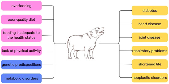 The occurrence of obesity in companion animals is largely influenced by the owner and other individuals with whom the animal interacts on a daily basis. Overfeeding, poor-quality diet, failure to adjust feeding practices to the animal’s health status and activity level, as well as lack of physical activity play significant roles (Figure 1) [1,3]. As a result, this condition is often stigmatized not only in humans but also in pets [4]. However, certain diseases, metabolic disorders (i.e., diabetes mellitus, hypothyroidism, hyperadrenocorticism) or genetic predispositions may also contribute to the development of obesity, although the extent to which heredity influences obesity development is still under investigation [5,6,7]. Research to date suggests that susceptibility to the obesity development may be hereditary up to 71–81% in humans [8]. This result indicates the need to investigate the intrinsic factors responsible for this disease, which could potentially be applicable in obese humans and also in animals.
