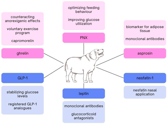 Food intake and absorption are key elements in maintaining the body’s energy homeostasis. These processes form a cycle comprising three main stages, namely hunger, satiation and satiety [13]. The regulation of these processes depends on complex mechanisms, including the activity of food intake-related proteins. These proteins play an important role both in the central nervous system and in peripheral organs, including the gastrointestinal tract (GIT) and adipose tissue, where they are secreted [14]. In different circumstances, abnormalities in the function of these proteins can occur. These abnormalities can have a variety of sources, ranging from mutations in genes encoding the protein through dysfunctions of enzymes necessary for the proteins to function properly to disruptions in the structure or function of the receptors to which the proteins should bind. These subtle dysregulations can lead to serious health consequences, which highlight the importance of understanding the mechanisms that regulate food intake and identifying factors that affect the function of proteins involved in this process [15]. Thus, the use of molecular biology techniques to study and understand mutations in genes, the study of gene expression, post-translational modifications of the proteins themselves but also of the enzymes responsible for their proper function and of the receptors for which proteins are ligands may be the key to understanding and combating obesity. Food intake-related proteins can be generally divided into two main groups: orexigenic peptides (enhancement of food intake) and anorexigenic peptides (inhibition of food intake) [16]. This review aims to thoroughly examine current research on regulating energy balance in companion animals, emphasizing the clinical application of orexigenic and anorexigenic peptides, including ghrelin, phoenixin (PNX), asprosin, glucagon-like peptide 1 (GLP-1), leptin, and nesfatin-1, in veterinary obesity management.