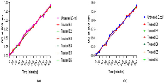 Comparison of the growth rate among treated and untreated E. coli isolates under the effect of (a) ascorbic acid and (b) paracetamol. The experiment was performed in triplicate. The statistical significance level was p < 0.001 using linear regression in GraphPad prism.