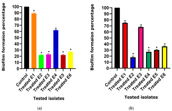 Anti-biofilm activity of (a) ascorbic acid and (b) paracetamol against E. coli isolates. The anti-biofilm activity between the treated and untreated (control) E. coli isolates under the effect of the tested drugs was compared. The results displayed represent the means ± standard errors. * Significance, p value < 0.05.