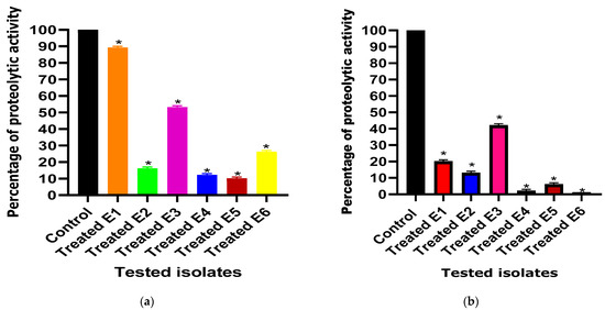 In the present study, both ascorbic acid and paracetamol were found to significantly decrease the proteolytic activity from 100% in untreated isolates to percentages ranging from 10% to 89% and from 1% to 43% in ascorbic acid- and paracetamol-treated isolates, respectively (Figure 3).