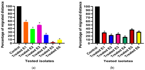 Interestingly, the swimming motility behavior exhibited a significant decrease from 100% in untreated isolates to percentages ranging from 2% to 57% and from 16% to 38% in the presence of ascorbic acid and paracetamol, respectively (Figure 4).