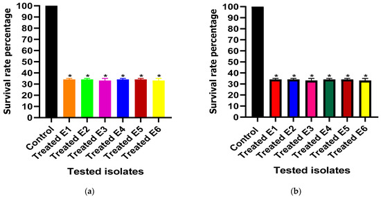 In brief, E. coli cultures were incubated with and without the sub-MICs of the tested drugs and adjusted to 0.5 McFarland standard in phosphate-buffered saline (PBS). Five groups of albino mice (Mus musculus) were studied, each consisting of 10 three-week-old mice. Two negative control groups were used, one group was intraperitoneally injected in the lower left quadrant of the abdominal region with 100 μL of sterile PBS, and the second group was left uninoculated. A positive control group was injected with 100 μL of untreated E. coli. The remaining two groups were injected with 100 μL of the treated isolates. The survival rate was recorded for three consecutive days and plotted by the Kaplan–Meier method [34.
