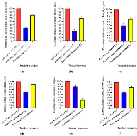 Effect of one-fourth MIC of ascorbic acid and paracetamol on virulence factor-regulating gene ((a) papC, (b) fimH, (c) ompT_m, (d) stcE, (e) fliC and (f) kpsMTII) in E. coli isolates. The data displayed represent the means ± standard errors. * Significance, p value < 0.05.