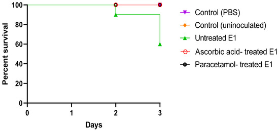 Overall, 100% survival was observed in the negative control groups (uninoculated and PBS-injected mice). Only 60% of the mice injected with untreated bacteria in the positive control survived. Interestingly, mice injected with bacteria treated with sub-MIC doses of both ascorbic acid and paracetamol displayed a 100% survival rate (Figure 7).