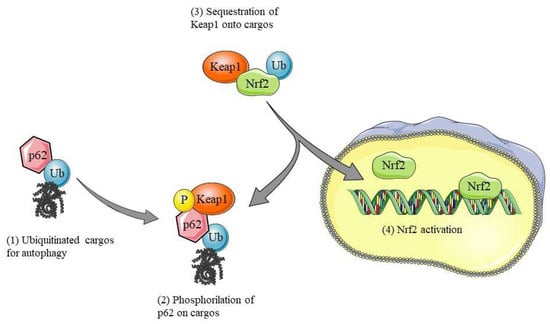 - Komatsu, M.; Kurokawa, H.; Waguri, S.; Taguchi, K.; Kobayashi, A.; Ichimura, Y.; Sou, Y.-S.; Ueno, I.; Sakamoto, A.; Tong, K.I.; et al. The Selective Autophagy Substrate P62 Activates the Stress Responsive Transcription Factor Nrf2 through Inactivation of Keap1. Nat. Cell Biol. 2010, 12, 213–223. [Google Scholar] [CrossRef]