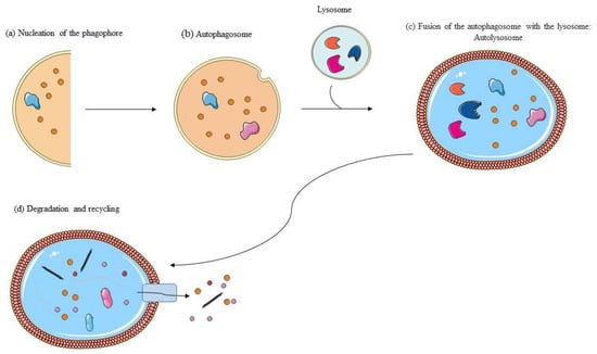 Autophagy takes place through three key steps including the following (Figure 2): (a) nucleation of the phagophore; (b) formation and maturation of the autophagosome with the ingestion of selective cytoplasmic material to be degraded; (c) fusion of the autophagosome with the lysosome; and (d) proteolytic degradation of the engulfed material and recycling of the components [29].