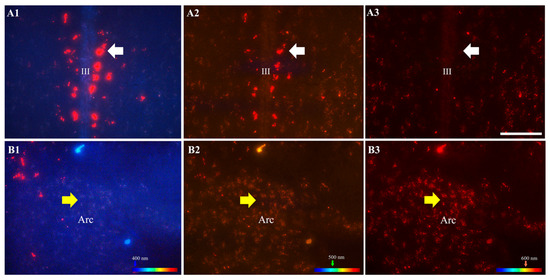 The migration of F10 to the brain was corroborated in a set of sections of the F10 + LPS 3 h group using an epifluorescence light microscope (Figure 1; bregma −2.16 mm). Self-fluorescence F10 particles crossed the BBB and migrated along the walls of the third ventricle (III), as reported by Ruiz-Velasco-Martínez et al. [11]. Self-fluorescence F10 particles were brighter and more prominent along the third ventricle (Figure 1A1–A3) than the smaller F10 particles observed in the hypothalamic arcuate nucleus area (Figure 1B1–B3). The brighter and larger red fluorescence for F10 was visible with the DAPI and green filters (emissions at 425 nm and 527 nm, respectively; Figure 1A1,A2), while the pink light-red fluorescence for F10 was visible with all the filters used (emission at 425–625 nm; Figure 1B1–B3).