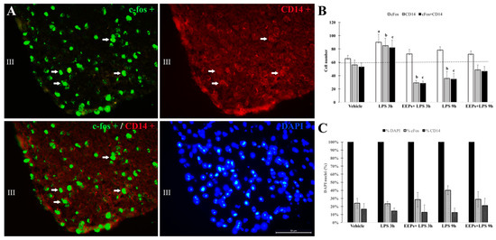 Figure 2. Response of c-fos and CD14 mRNA in the arcuate nucleus of mice receiving P. sacharosa extract (EEPs) before LPS. Dual-fluorescent in situ analyses for c-fos+/CD14+ cells were made under an epifluorescence light microscope to count DAPI+ nuclei (blue fluorescence; UV excitation 340–380 nm/emission 425 nm), c-fos+ cells (green fluorescence; excitation filter 480/40 nm/emission 527/30 nm), and CD14+ cells (red fluorescence; excitation filter 560/40 nm/emission 645/75 nm), at bregma −1.46 to −2.06 mm. (A) Fluorescently labeled c-fos+ mRNA and CD14+ mRNA cells in the hypothalamic arcuate nucleus of male mice exposed to LPS 3 h (white arrows in (A) denote some examples of double labelled cells). (B) Dual-labeled c-fos+/CD14+ cells increase in the LPS 3 h group and decrease below basal levels in EEPs+ LPS 3 h and LPS 9 h groups; a dotted line from the vehicle to the experimental groups highlights this difference. (C) Percentage of c-fos+ and CD14+ cells regarding DAPI+ nuclei (blue fluorescence). a: Significantly different from the vehicle (p < 0.05); b, c: significantly different from the vehicle, EEPs + LPS 3 h, and LPS 9 h (p < 0.05). III = third ventricle. Scale bar = 50 μm.