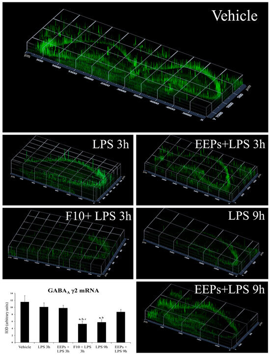 Figure 3. Fluorescent in situ hybridization for GABAA γ2 mRNA in the dorsal hippocampus of C57/BL6/JN male mice exposed to LPS. Representative 2.5D view images were obtained with a Zeiss 900 laser scanning confocal microscope in the vehicle, LPS 3 h, F10 + LPS 3 h, LPS 9 h, and F10 + LPS 9 h groups (Zen Blue Edition software v 3.4, from Zeiss). The immunofluorescence intensity by the FISH technique can be visualized as peaks of different heights in the Z-axis. The highest peaks can be interpreted as exhibiting the highest intensity and content of GABAA γ2. The X- and Y-axes show the length and width in µm of the hippocampal region area scanned. The vehicle shows the highest peaks and staining intensity compared to those of F10 + LPS 3 h or LPS 9 h. Contrary to F10 + LPS 3 h or LPS 9 h, EEPs + LPS 9 h returned to the basal GABAA γ2 mRNA level. The graph at the bottom left shows the semi-quantitative analysis for GABAA γ2 mRNA, expressed as integrated optical density (IOD; density × area = arbitrary units). Statistical significance among groups was determined by one-way ANOVA and the Holm–Sidak post hoc test; differences were considered significant at p < 0.05. a: Significantly different from the vehicle (p < 0.01); b: significantly different from LPS 3 h (p < 0.05); c: significantly different from EEPs+ LPS 3 h (p < 0.05).