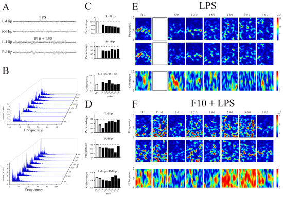 Figure 4. LPS administration decreases theta oscillations in the hippocampus of freely moving rats. (A) Representative LFP of the left (L) and right (R) hippocampus in rats administered with LPS or F10 + LPS. (B) In the Fast Fourier Transform waterfall plot, a high theta LFP peak can be observed at the baseline, disappearing after the LPS administration, whereas the pretreatment with F10 maintained the theta LFP over time. (C) Normalized power spectrum (100%) and normalized coherence (1) of theta LFP of the LPS group. Note the significant decrease in the theta LFP power spectrum. (D) Normalized power spectrum (100%) and normalized coherence (1) of the theta LFP of the F10 + LPS group. (E) Representative spectrograms of the theta bandwidth and coherence of the LPS group, where the evolution in the time domain is shown. (F) Representative spectrograms of the theta bandwidth and coherence of the F10 + LPS group, where the evolution in the time domain is shown.