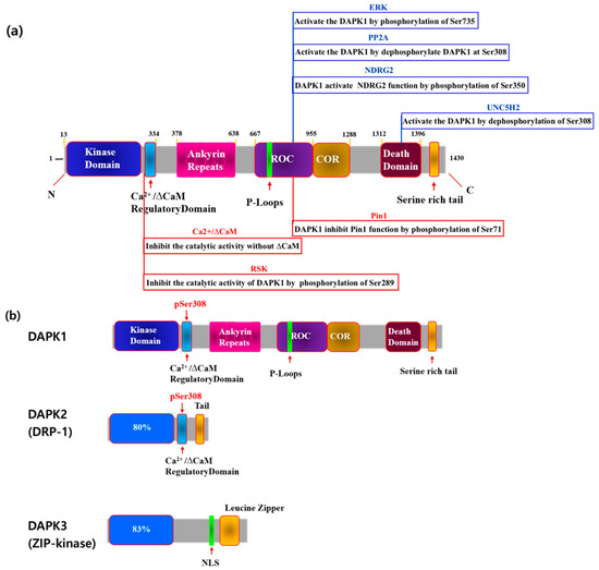 Schematic depiction of the multi-domain organization of the (DAPK1) protein. (a) The size of the amino acid regions of DAPK1 and the interacting proteins in each region are shown in the diagram. The blue protein is an interactor that activates the function of DAPK1, and the red protein is an interactor that inhibits it. The blue protein is indicated above the DAPK1 amino acid sequence, and the red protein is indicated below. (b) Schematic diagram of the DAPK family.