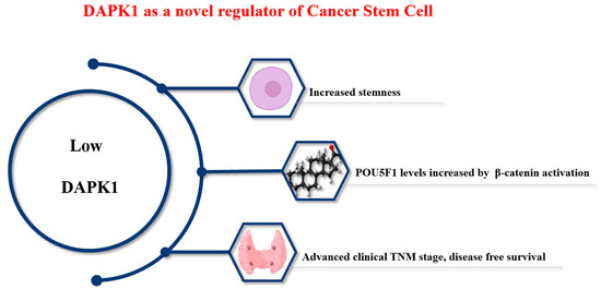 Low DAPK1 levels promote stemness in thyroid cancer. Low DAPK1 directly regulates the level of β-catenin, thereby increasing the level of OCT4 (POU5F1), the main factor that determines CSCs. This indicates a close relationship of DAPK1 with the aggressiveness of PTC cancer (tumor size, lymph node metastasis, and treatment-refractory) and suggests DAPK1 as a therapeutic target and an independent prognostic marker in thyroid cancer.