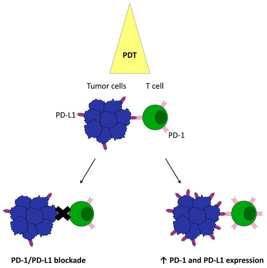Programmed cell death protein 1 (PD-1) and programmed death-ligand (PD-L1) are typical immune checkpoints that transmit inhibitory signals to silence host immunity [31,32]. The up-regulation of PD-L1 in tumor cells has been shown to be generally associated with tumor progression, proliferation, and invasion; anti-apoptotic signaling; and T-cell inhibitory activity through PD-1 engagement [33,34]. Reducing their negative effects is particularly desirable in cancer therapy. A number of recent studies describe the potential of PDT to improve the efficacy of the immune response by affecting immune checkpoints. Work by Gurung et al. demonstrates that PDT with PS chlorin e6 through an unexplained mechanism has the ability to block the PD-1/PD-L1 axis and increase CD8+ T-cell activity. However, they observed that despite the increased infiltration of these cells in some of the mice tested, they were depleted and an antitumor immune response was not induced [35]. On the other hand, Lobo et al. and Anand et al. show that in some tumor cells, PDT increased CTLA-4 and PD-L1 and PD-1 expression on lymphocytes, as schematically shown in Figure 1 [36,37]. However, this may have a potentially beneficial effect on immune checkpoint inhibitors (ICI) therapy, as pre-existing T cells in the tumor are a prerequisite for response to anti-PD-1 therapy, and the lack of reactive PD-L1 expression may indicate a poor response to PD-1 blockade therapy due to impaired T cells infiltrating the tumor [38]. Moreover, it has been found that PDT can stimulate cells in some tumors to exhibit high levels of CD80 molecules on their surfaces. Overexpression of CD80 enhances tumor immunogenicity [36]. The formation of a cis-PD-L1-CD80 duplex, by binding CD80 to PD-L1, attenuates PD-L1-PD-1 binding and abrogates PD-1 function [39]. Removing this PD-1 restriction has been shown to have an immunosuppressive effect and may be effective in treating autoimmune disease [40]. The cis-PD-L1-CD80 duplex also inhibits CTLA-4 inhibitory receptors binding to CD80 in cancer cells [36]. Delcanale et al. point out that there does not appear to be a correlation between PDT efficacy and PD-L1 expression levels, indicating that mechanisms other than simple receptor density determine treatment outcome [40]. In conclusion, reports on PDT’s ability to modulate PD-1 and PD-L1 levels lead to conflicting conclusions, and the mechanism is not completely elucidated.