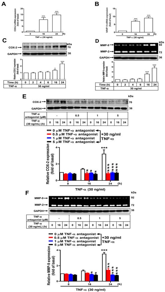Induction of COX-2 and MMP-9 expression by TNF-α through the TNF-α receptor in normal GES-1 cells. Normal GES-1 cells were stimulated with TNF-α at a concentration of 30 ng/mL for 0, 16, or 24 h. The transcripts of (A) COX-2 and (B) MMP-9 were measured by qRT-PCR. In addition, (C) GES-1 cells were stimulated with TNF-α at a concentration of 30 ng/mL for 0, 2, 4, 6, 16, or 24 h and the expression of COX-2 was examined by Western blot analysis, (D) whereas the enzymatic activity of MMP-9 was assessed by gelatin zymography. The TNF-α antagonist effectively suppressed TNF-α-induced expression of (E) COX-2 and (F) MMP-9 in GES-1 cells. The data are presented as the mean ± SEM of three independent experiments. (* p < 0.05, *** p < 0.001 vs. control cells at 0 h; # p < 0.05, ## p < 0.01, ### p < 0.001 vs. TNF-α-stimulated cells).