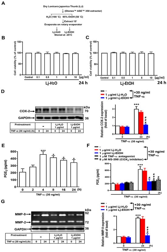 Lonicera japonica Thunb. ethanol extract exerts a suppressive effect on TNF-α-induced expression of PGE2, COX-2, and MMP-9 in normal GES-1 cells. (A) Lonicera japonica Thunb. extracts were prepared. (B) The effects of a water extract (Lj-H2O) and ethanol extract (Lj-EtOH) on the viability of normal GES-1 cells were evaluated. (C) GES-1 cells were treated with various concentrations of Lonicera japonica Thunb. extracts (0, 0.1, 0.5, 1, 5, or 10 μg/mL) for 24 h and cell viability was measured by CCK-8 assay. (D) The cells were divided into two groups: one for control and the other for treatment with Lj-H2O (1 μg/mL) or Lj-EtOH (1 μg/mL) for 1 h. TNF-α (30 ng/mL) was then added to both groups of cells. COX-2 was measured by Western blot analysis. (E) Quantitation of PGE2 protein was carried out using an enzyme-linked immunosorbent assay (ELISA) at 0, 2, 4, 8, 16, and 24 h of treatment. (F) Cells were treated with Lj-H2O (1 μg/mL), Lj-EtOH (1 μg/mL), TNF-α antagonist (1 μg/mL), or NS-398 (5 μM; COX-2 inhibitor). The conditioned medium was collected and PGE2 levels were measured by ELISA after 4 h. (G) The MMP-9 activity of GES-1 cells was measured by gelatin zymography after 24 h. The data are presented as the mean ± SEM of three independent experiments. (* p < 0.05, *** p < 0.001 vs. control cells at 0 h; # p < 0.05, ### p < 0.001 as compared to TNF-α-treated cells).