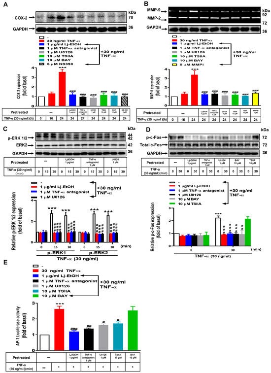 Lonicera japonica Thunb. ethanol extract exerts an inhibitory effect on TNF-α-induced COX-2 and MMP-9 expression in normal GES-1 cells by blocking the TNFR/ERK1/2/c-Fos pathway. (A,B) GES-1 cells were treated with TNF-α (30 ng/mL) for 24 h with a significant increase in COX-2 and MMP-9 expression. In drug pretreatment conditions, GES-1 cells were treated with Lj-EtOH (1 μg/mL), TNF-α antagonist (1 μM), U0126 (1 μM), TSIIA (10 μM), BAY 11-7082 (10 μM), and NS-398 (5 μM) or MMP9i (5 μM) for a duration of 1 h before the introduction of TNF-α; Subsequently, the cells were incubated with TNF-α for a period of 24 h. The level of COX-2 protein expression was determined by Western blot analysis (A), and the enzymatic activity of MMP-9 was determined by gelatin zymography (B). (C) GES-1 cells were treated with Lj-EtOH (1 μg/mL), TNF-α antagonist (1 μM), or U0126 (1 μM) for 1 h before the addition of TNF-α (30 ng/mL) for 0, 15, or 30 min. The phosphorylation of ERK1/2 (p-ERK 1/2) was measured by Western blot analysis. (D) GES-1 cells were treated with Lj-EtOH (1 μg/mL), TNF-α antagonist (1 μM), U0126 (1 μM), BAY 11-7082 (10 μM), or TSIIA (10 μM) for 1 h before the addition of TNF-α (30 ng/mL) for 0 or 30 min. The phosphorylation of c-Fos (p-c-Fos) was measured by Western blot analysis. (E) The GES-1 cell line was transfected with human AP-1–Luc response element reporter plasmids. The cells were then pretreated with Lj-EtOH (1 μg/mL), TNF-α antagonist (1 μM), U0126 (1 μM), TSIIA (10 μM), or BAY 11-7082 (10 μM) for 1 h. Following pretreatment, the cells were exposed to TNF-α for 1 h. Luciferase activity was measured to determine the activity of AP-1 and normalized to that of Renilla luciferase activity. The data are presented as the mean ± SEM of three independent experiments. (*** p < 0.001 vs. control cells at 0 h; # p < 0.05, ## p < 0.01, ### p < 0.001 as compared to TNF-α-treated cells).