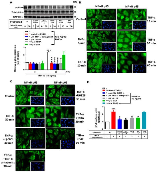 Western blot analysis was carried out to determine whether Lj-EtOH, TNF-α antagonist, U0126, TSIIA, and BAY 11-7082 affected TNF-α-induced NF-κB (p65) phosphorylation. Thus, the phosphorylation of NF-κB (p65) was measured at various time intervals. Pretreatment with Lj-EtOH, TNF-α antagonist, U0126, TSIIA, and BAY 11-7082 resulted in the suppression of NF-κB phosphorylation (p-p65) upon TNF-α stimulation in a time-dependent manner (Figure 4A). An immunofluorescence stain was used to determine the effect of Lj-EtOH on the translocation of NF-κB from the cytoplasm to the nucleus. After exposure to 30 ng/mL TNF-α for 0, 5, 10, 15, 30, or 60 min, the gradual movement of NF-κB into the nucleus was observed, with the most pronounced effect occurring within 30 min. The translocation of NF-κB persisted for the entire 60 min assessment period (Figure 4B).