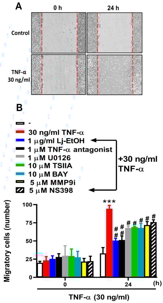 GES-1 cells were seeded in 6-well plates and cultured until confluence. The medium was replaced with a serum-free RPMI medium and incubated for 24 h. The cell monolayer was incised with disposable cell scrapers and any dislodged cells were removed with PBS. Following pretreatment with Lj extracts (1 μg/mL) or inhibitors targeting TNFα (1 μM), NF-κB (BAY 11-7082) (10 μM), c-Fos (TSIIA) (10 μM), ERK1/2 (U0126) (1 μM), MMP-9 (MMP9i) (5 μM), or COX-2 (NS-398) (5 μM) for 1 h, serum-free medium with or without TNF-α (30 ng/mL) was added to each well. Image acquisition was carried out by microscopy using a digital camera (Olympus, Tokyo, Japan) at two time points: 0 and 24 h. For each time point, a set of four-phase images was acquired and the average of these images was normalized to the initial image recorded at 0 h. The normalized values were subsequently averaged across all experimental conditions. The data represent three distinct and separate experimental trials [24].