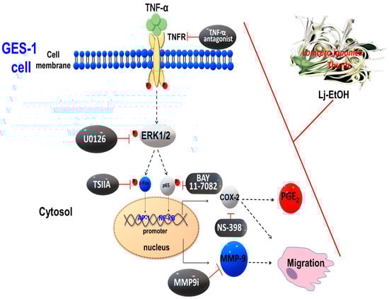 Diagram illustrating the effect of Lonicera japonica Thunb. ethanol extract on TNF-α-induced COX-2-derived PGE2 production and MMP-9 as well as the migration of normal GES-1 cells. Schematic diagram of the signaling pathways associated with the activity of Lj-EtOH extracts, which attenuated TNF-α-induced inflammation by downregulating COX-2, PGE2, and MMP-9 expression in normal GES-1 cells. Lonicera japonica Thunb. ethanol extract attenuates TNF-α-induced COX-2 and MMP-9 expressions in normal GES-1 cells through TNFR/ERK1/2/c-Fos and NF-κB pathways.