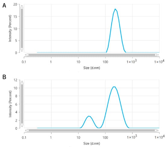Dynamic Light Scattering Characterization of Exosome-Like Nanoparticles (ELNs) in Polyfloral Honey. (A) Unpasteurized honey, Z-Average—195.9, mean peak—249.7; (B) Pasteurized honey, Z-Average—113.3, 1st mean peak—26.28, 2nd mean peak—236.9.